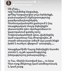 «Մի չհայ, որը հանձնեց Արցախը, զոհեց հազարավոր լույս երեխեքի, բանտարկում է ճշմարտությունը բարձրաձայնողներին, հետևողականորեն քանդում է Հայ Առաքելական Սուրբ եկեղեցին՝ փաստորեն դեռ «կոմպրոմատ է» կարողանում գտնել որոշ հոգևորականների վրա, վախեցնել կամ սպառնալ հայ ժողովրդին…
