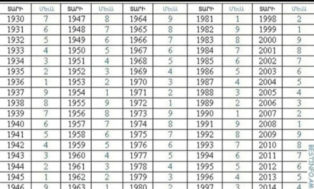 Աղյուսակում գտեք Ձեր ծնված տարին և իմացեք, թե ինչպիսի կյանք է Ձեզ համար նախատեսված.