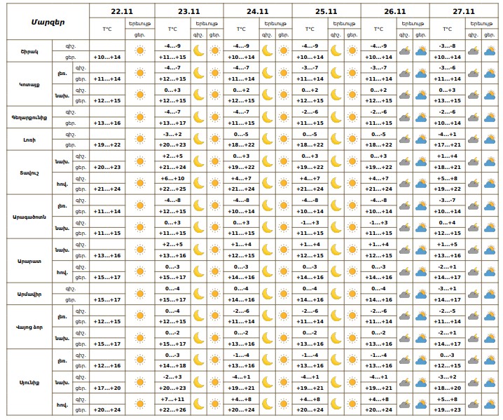 Նոյեմբերի 23-27-ին սպասվում է առանց տեղումների եղանակ, լուսադեմին Արարատյան և Շիրակի դաշտում սպասվում է կարճատև մառախուղ: Քամին հարավարևմտյան՝ 2-5մ/վ: Օդի ջերմաստիճանը նոյեմբերի 23-ին ցերեկային ժամերին Լոռիում, Տավուշում և Սյունիքում աստիճանաբար կբարձրանա ևս 1-2 աստիճանով, մնացած շրջաններում Էապես չի փոխվի։
