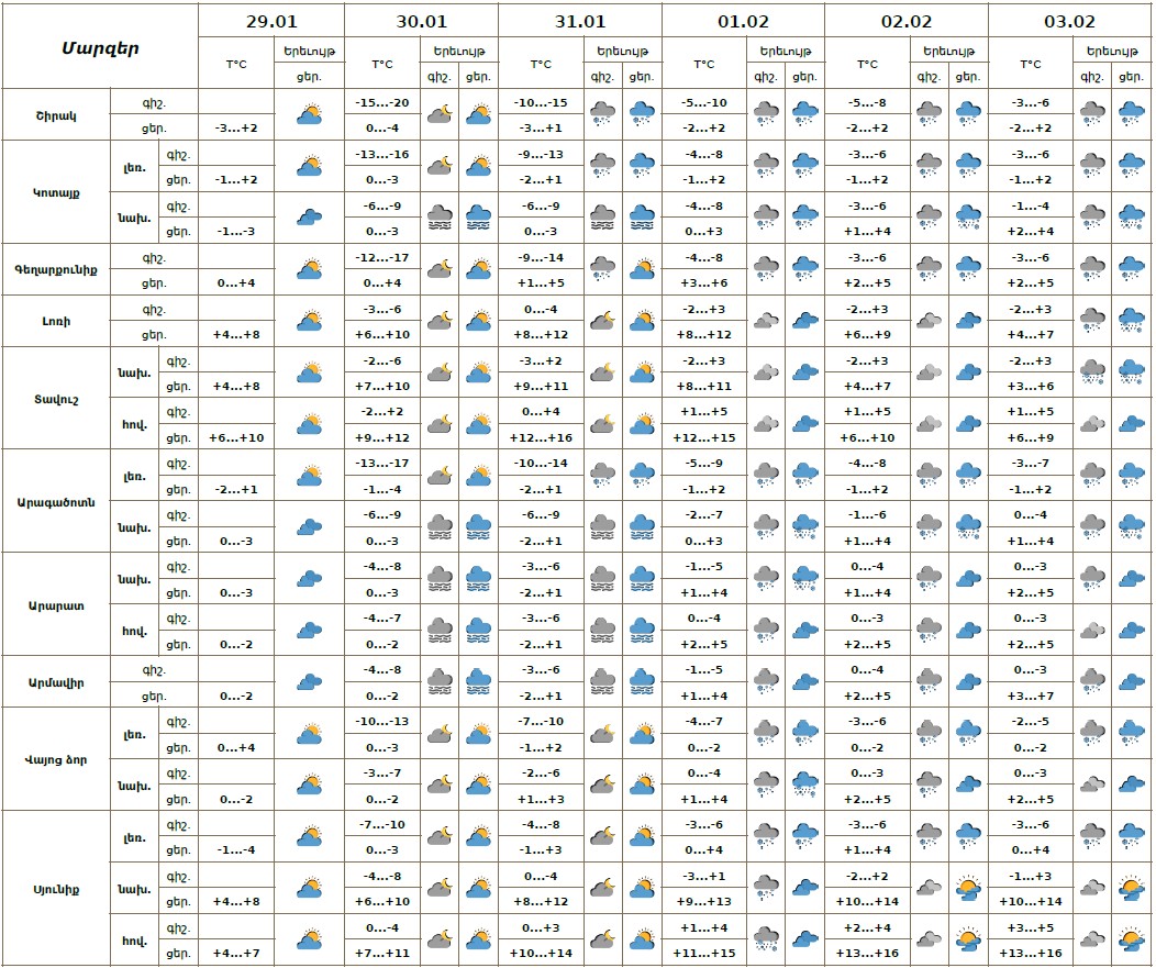 Փետրվարի 1-3-ին սպասվում է ձյուն։ Հունվարի 31-ին սպասվում է մառախուղ։