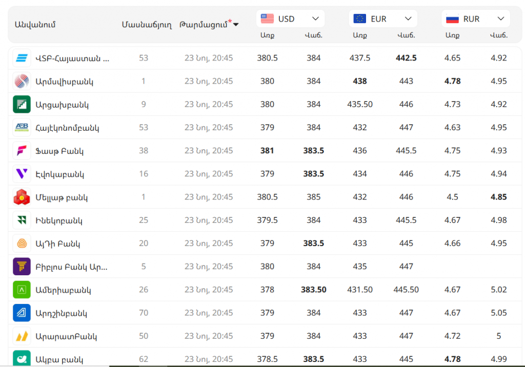 rate.am կայքը տեղեկություն է հրապարակել՝ Երևանի բանկերում տարադրամի փոխարժեքների հետ կապված։ Պատկերը հետևյալն է․ԱՄՆ մեկ դոլարի փոխարժեքը երևանյան բանկերում կազմել է՝