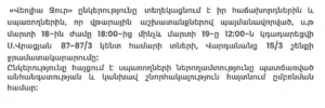 «Վեոլիա Ջուր» ընկերությունը տեղեկացնում է իր հաճախորդներին և սպառողներին, որ վթարային աշխատանքներով պայմանավորված, ս.թ մարտի 20-ին ժամը 07:00-20:00-ն կդադարեցվի գ.Արգել 2 փ., 4 փ., 4 փ. 1 Նրբ., 4 փ. 2 Նրբ., 5 փ. ,5 փ. 2 Նրբ., 6 փ., 6 փ. 1 Նրբ. ,9 փ., 9 փ. 1 Նրբ., 8 փ. ,18 փողոցի ջրամատակարարումը: